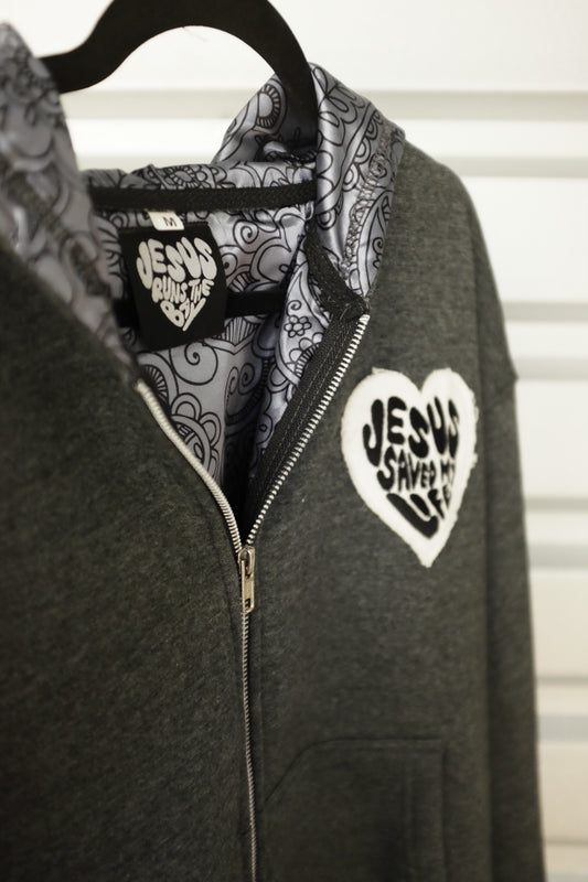 “Jesus Saved My Life” Heather Grey Zip-Up Hoodie